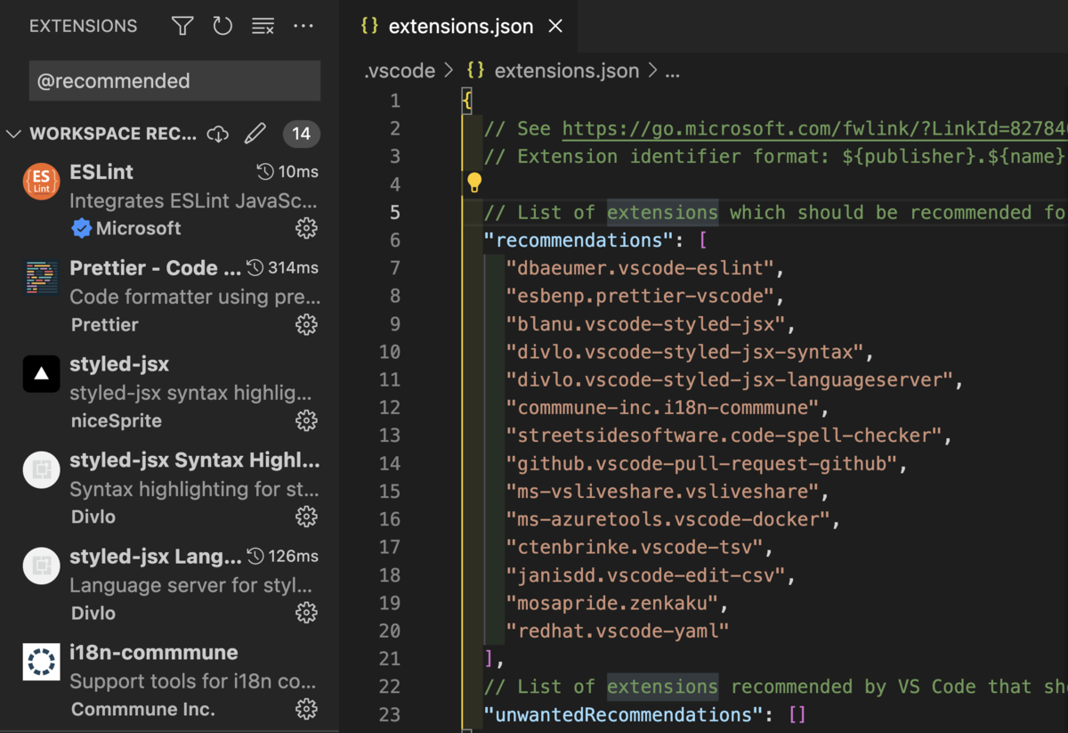 .vscode/extensions.jsonというファイルに開発で必要な拡張を書いて共有します。先程名前の上がった ESLint, CSpell の拡張もあります。